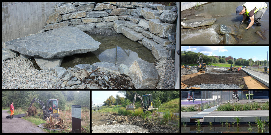 Over the past decade, a total of 2,810 meters of waterways have been reopened. The reopened parts have rapids, deep pools, and recreational areas as well as a purification system to manage runoff from roads. One example is the Teglverksdammen Project which is a reopening of around 650 meters of the stream Hovinbekke. The project has been planned and designed as a natural cleaning system with several sedimentation basins, a stream with water rapids, a small lake, and shallow waters with dense vegetation. Stormwater from a nearby school is also safely led into the newly reopened stream.